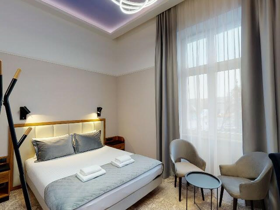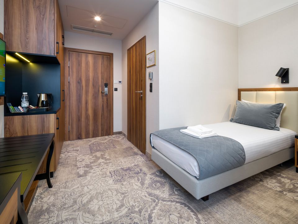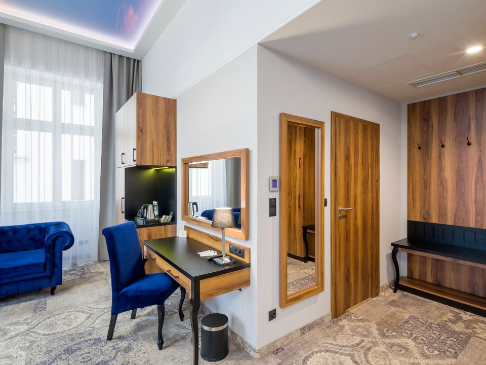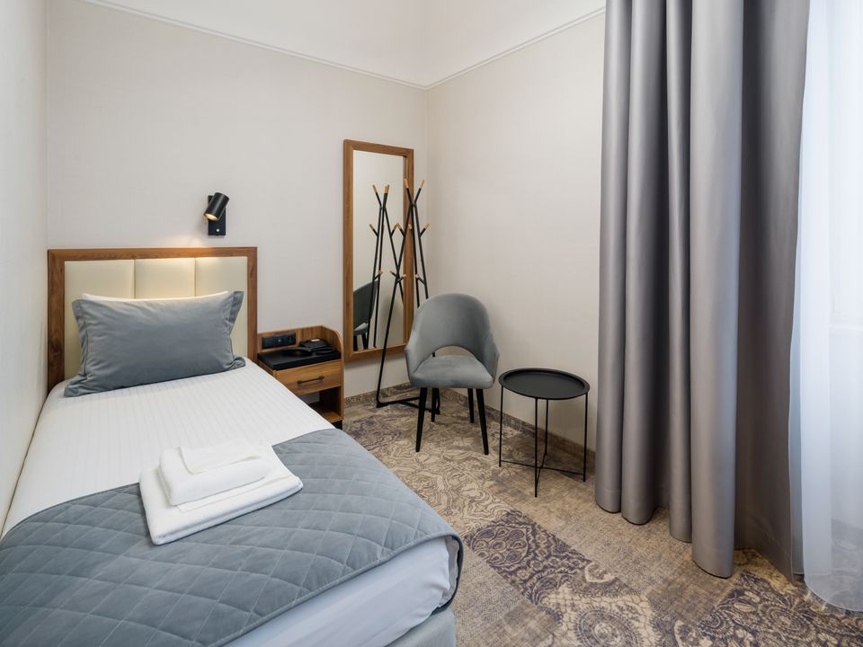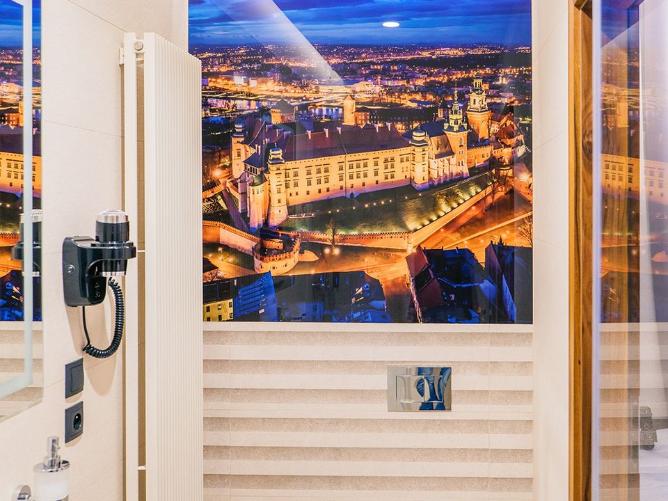 The room was created for solo travelers in mind. At your disposal we have prepared a living room with a comfortable bed, desk and chair, SMART TV, tea and coffee making facilities, fridge and safe. We guarantee that you will not miss anything. The bathroom is spacious and adapted to the highest hotel standards. The heating and air conditioning control panel and the beautiful view of our private piece of sky on the ceiling will surely make you return here during your next visits to Krakow.