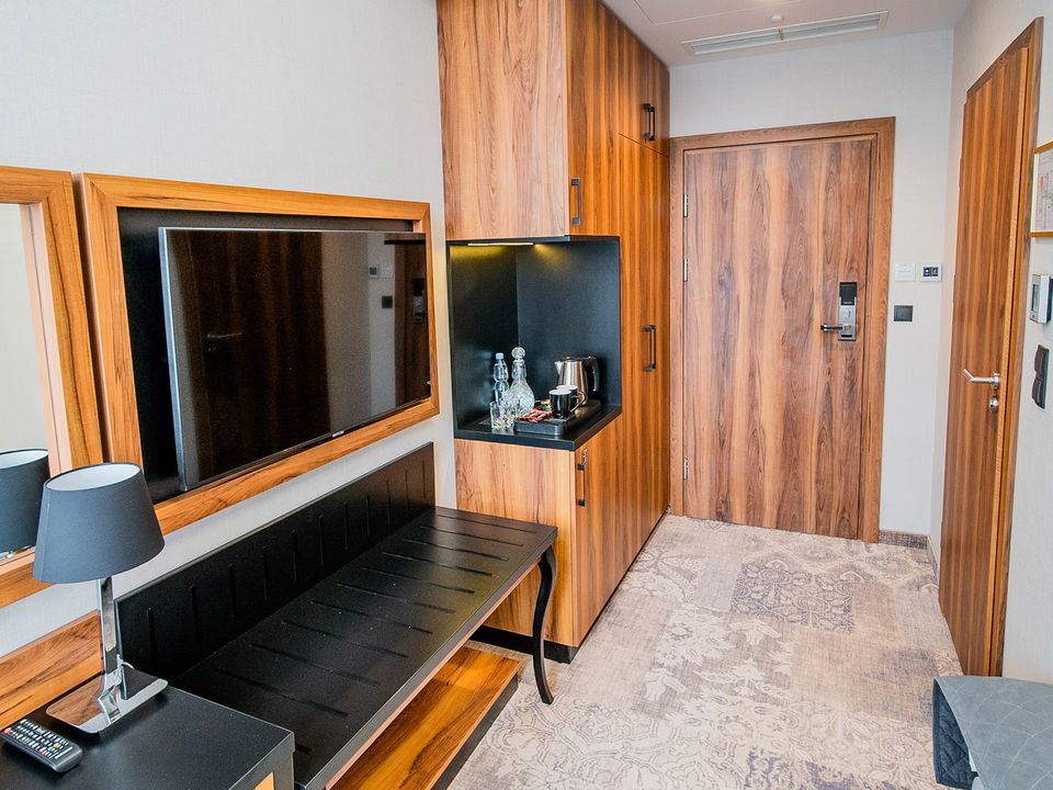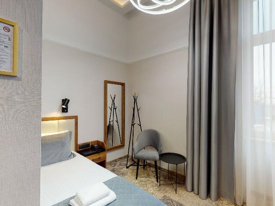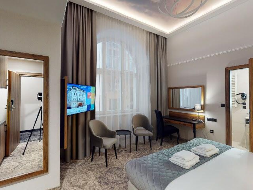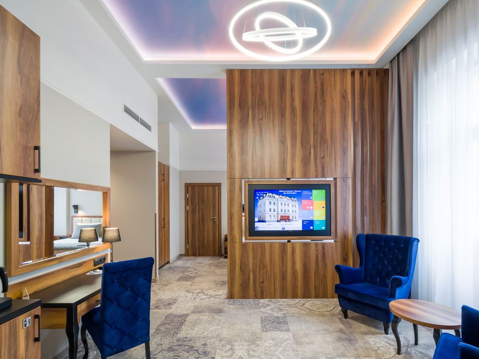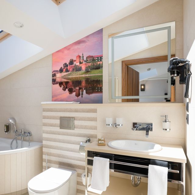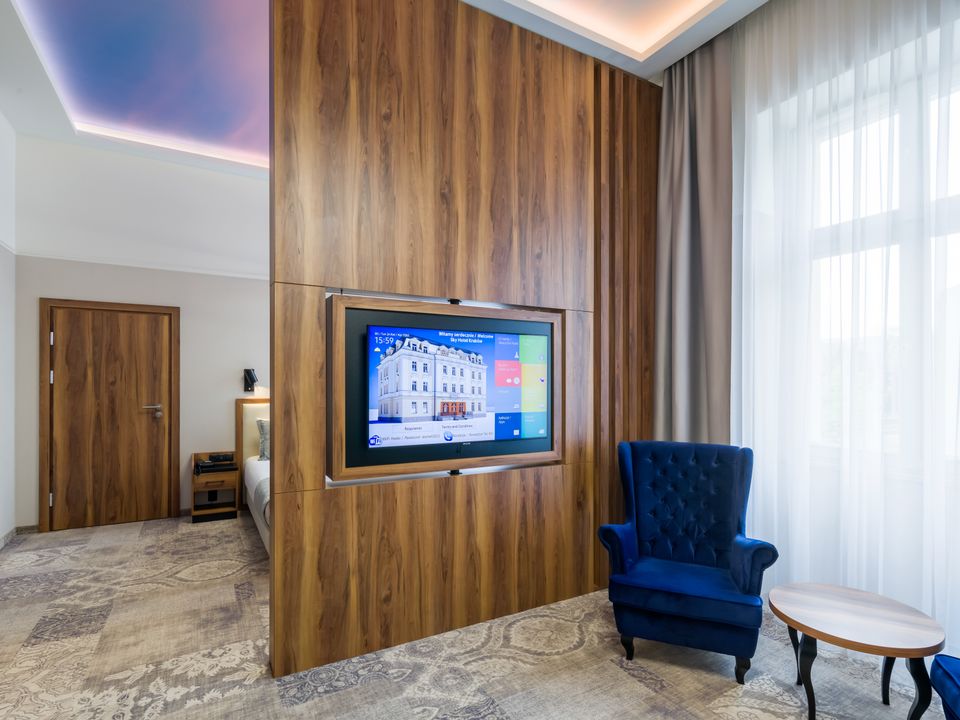 The room was created for solo travelers in mind. At your disposal we have prepared a living room with a comfortable bed, desk and chair, SMART TV, tea and coffee making facilities, fridge and safe. We guarantee that you will not miss anything. The bathroom is spacious and adapted to the highest hotel standards. The heating and air conditioning control panel and the beautiful view of our private piece of sky on the ceiling will surely make you return here during your next visits to Krakow.