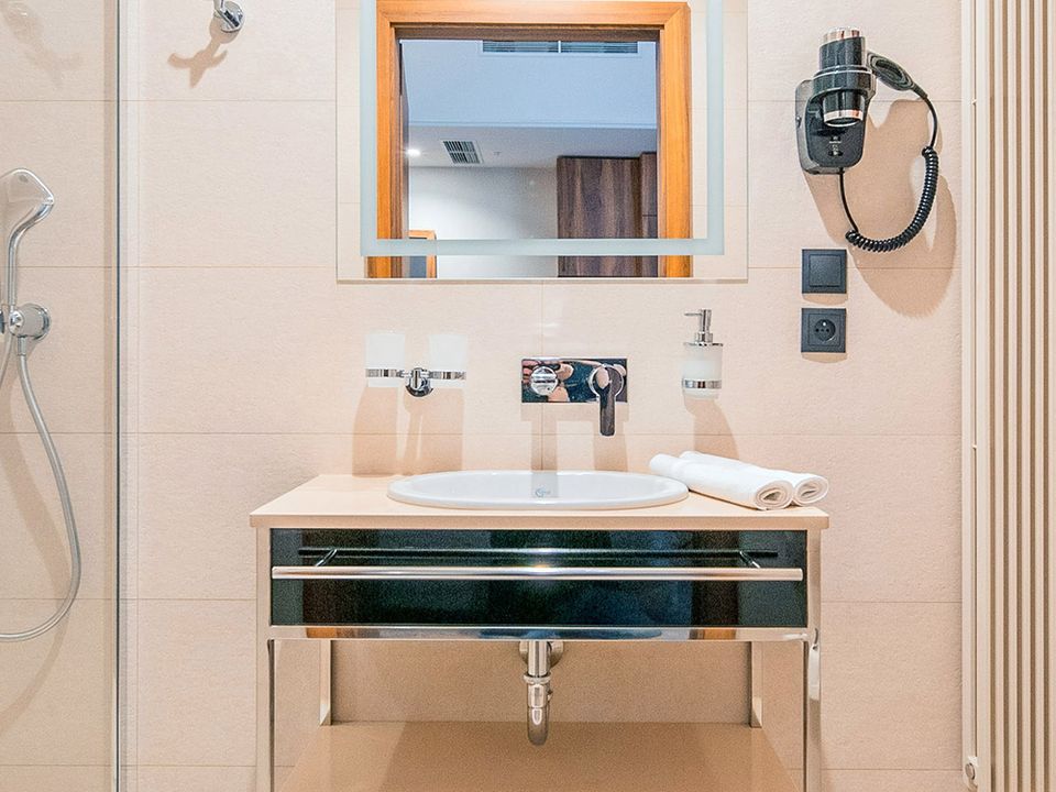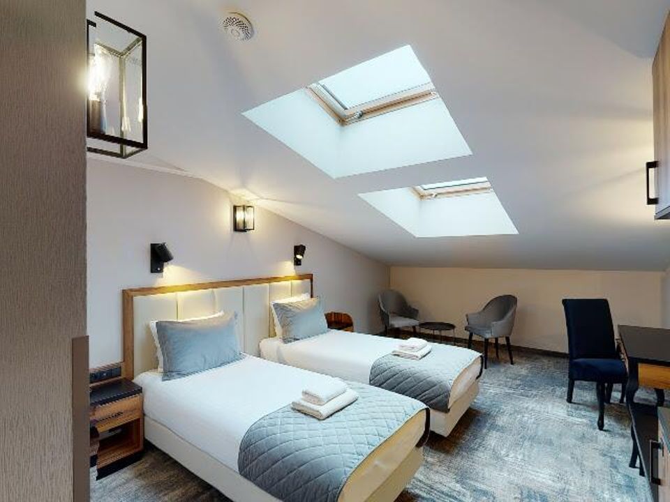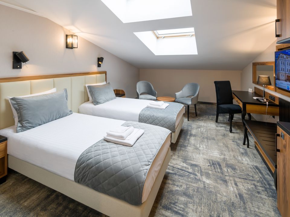 Our charming and atmospheric twin attic double room is a fantastic choice for business or leisure travelers who need 2 single beds. The room equipment has been tailored to the needs of our guests and we are sure that they will not miss anything. Inside there are two 90 cm wide single beds, desk and chair, large wardrobe, SMART TV, safe, fridge and tea and coffee making facilities. There is a choice of rooms both with a shower cabin and a bathtub; underfloor heating provides extra comfort.