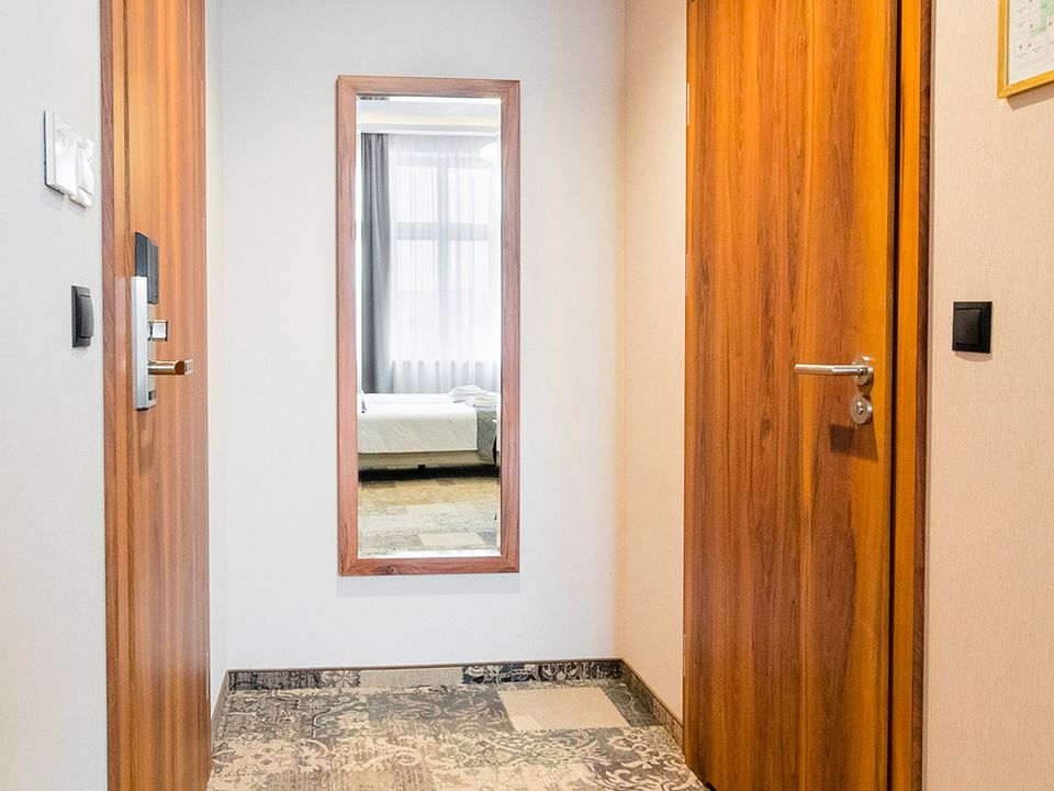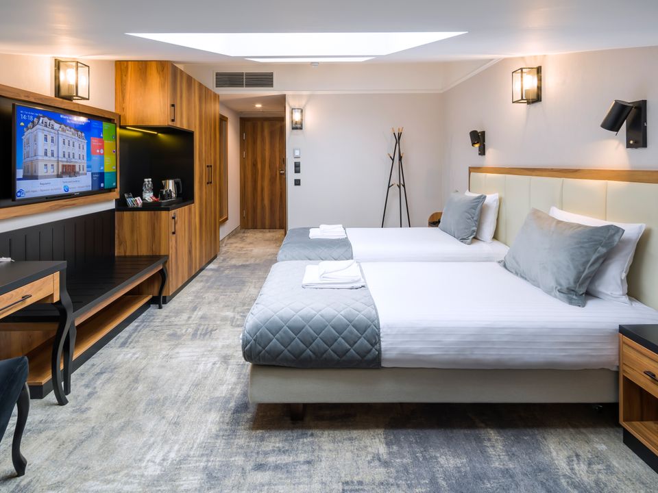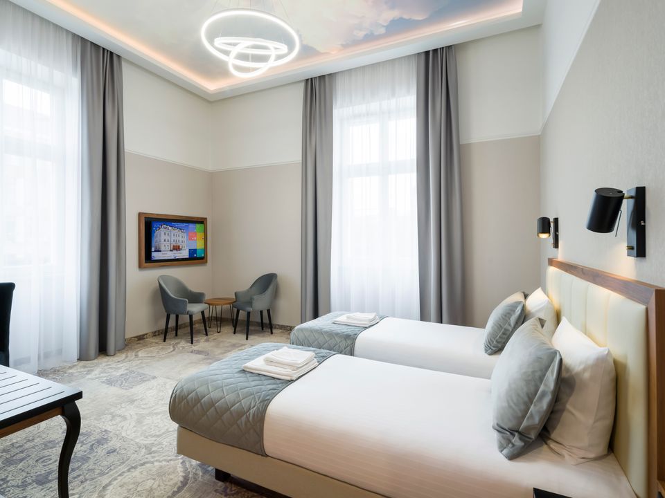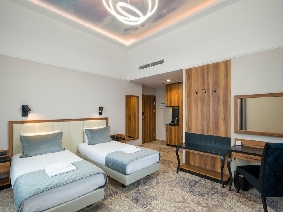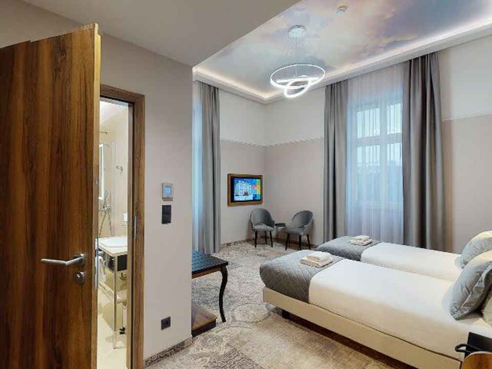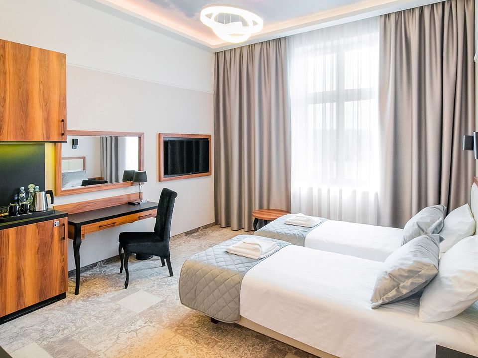 The room equipment has been designed for both individual clients and business travelers. The rooms have two comfortable hypoallergenic beds, TV SMART, tea and coffee making facilities. The air conditioning system keeps the room temperature perfect at all times. Even when your business duties require you to spend the whole day with your laptop in your room, we guarantee that working under the scenery of the sky on the ceiling will be pure pleasure. A bathroom with a shower cabin, underfloor heating, a hair dryer and a set of cosmetics will ensure extra comfort.