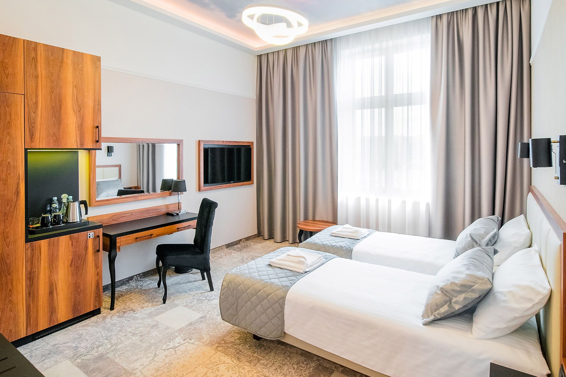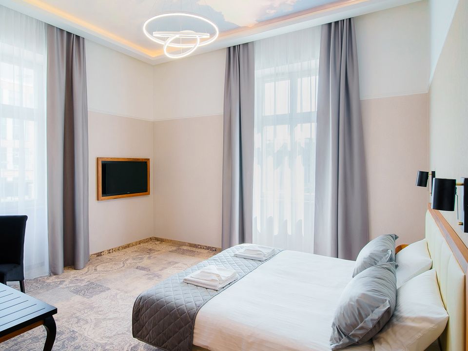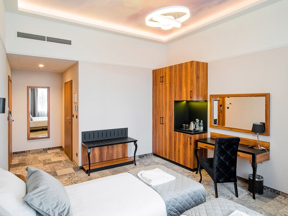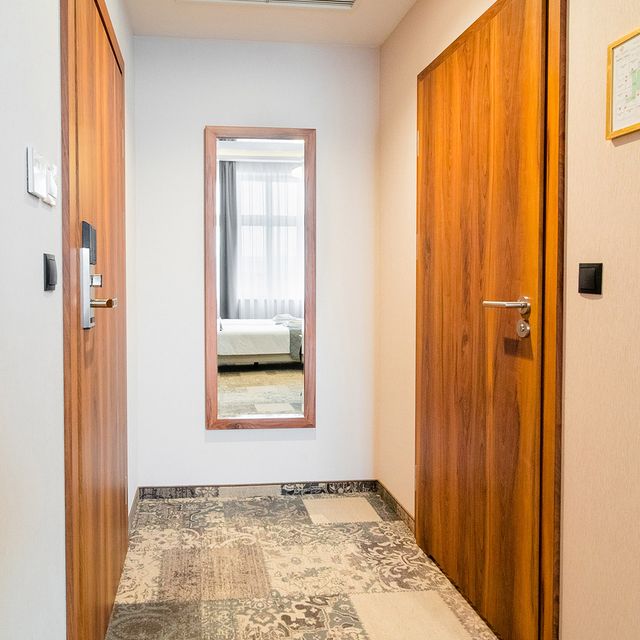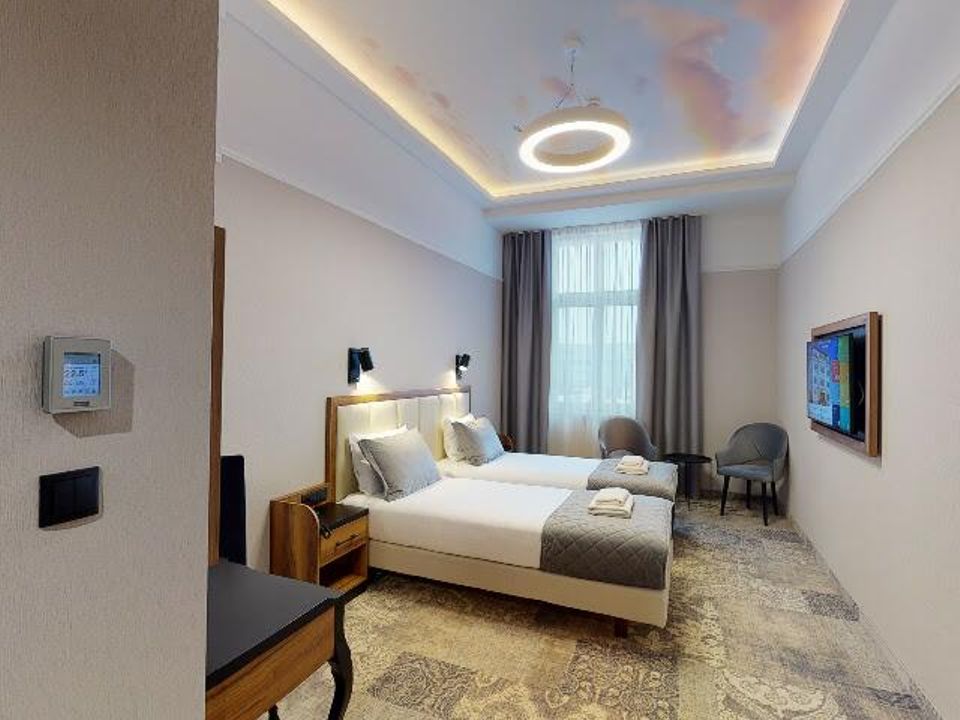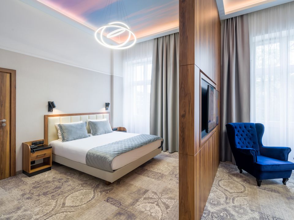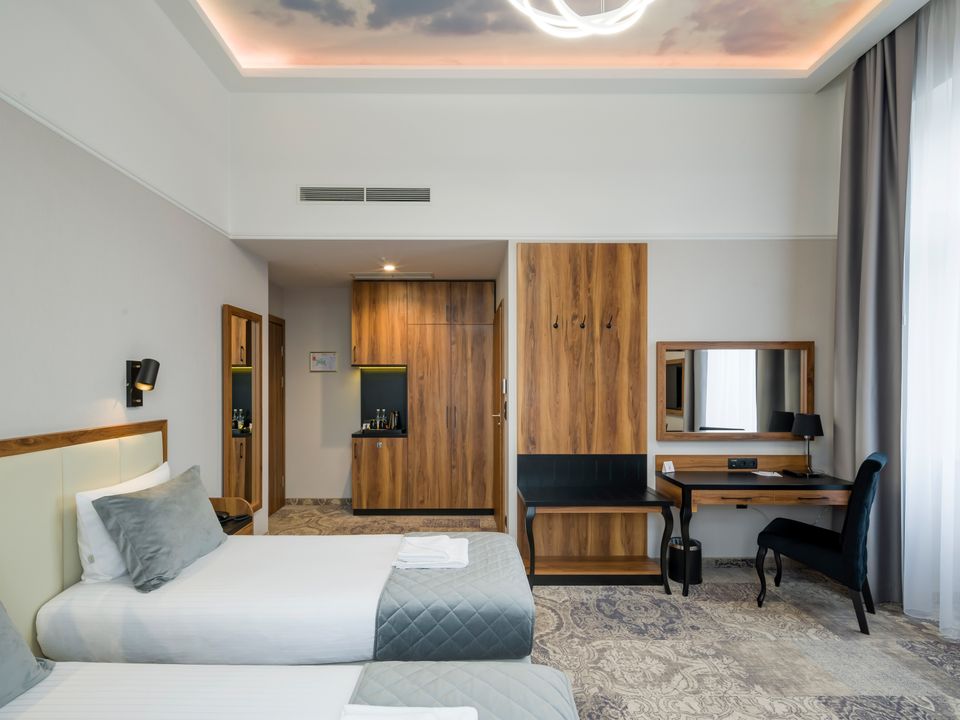 The room equipment has been designed for both individual clients and business travelers. The rooms have two comfortable hypoallergenic beds, TV SMART, tea and coffee making facilities. The air conditioning system keeps the room temperature perfect at all times. Even when your business duties require you to spend the whole day with your laptop in your room, we guarantee that working under the scenery of the sky on the ceiling will be pure pleasure. A bathroom with a shower cabin, underfloor heating, a hair dryer and a set of cosmetics will ensure extra comfort.