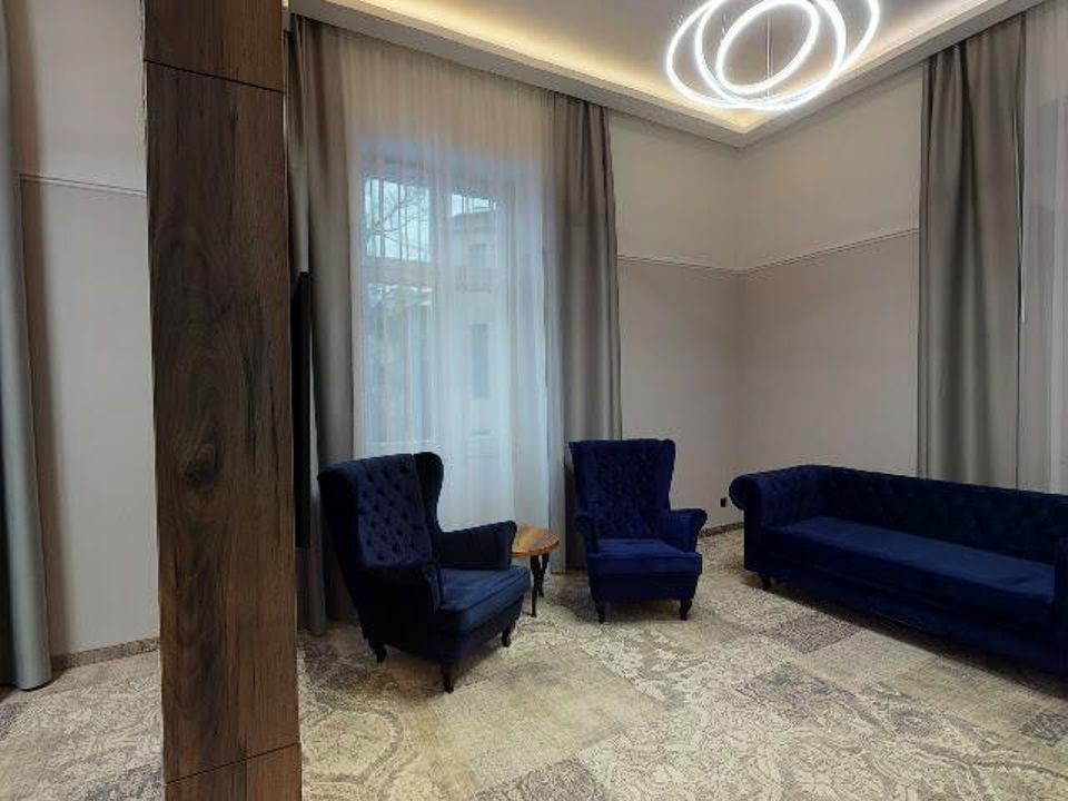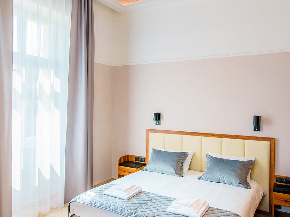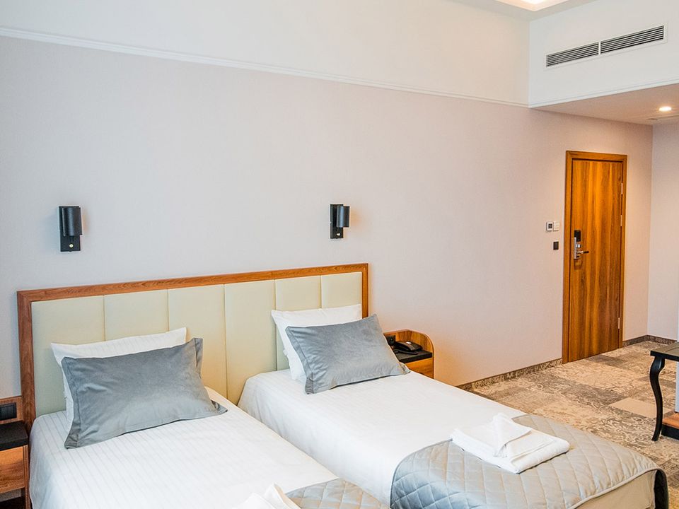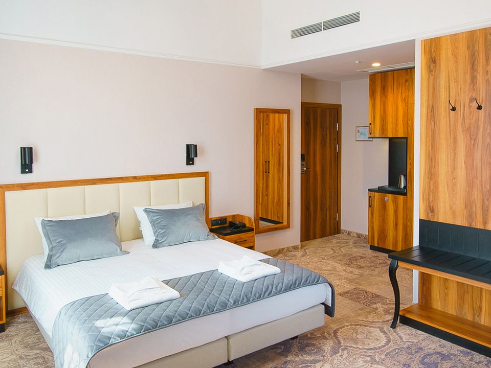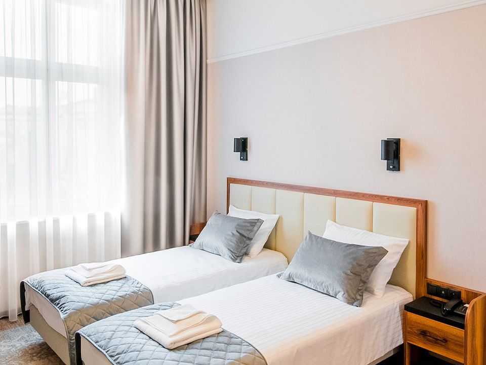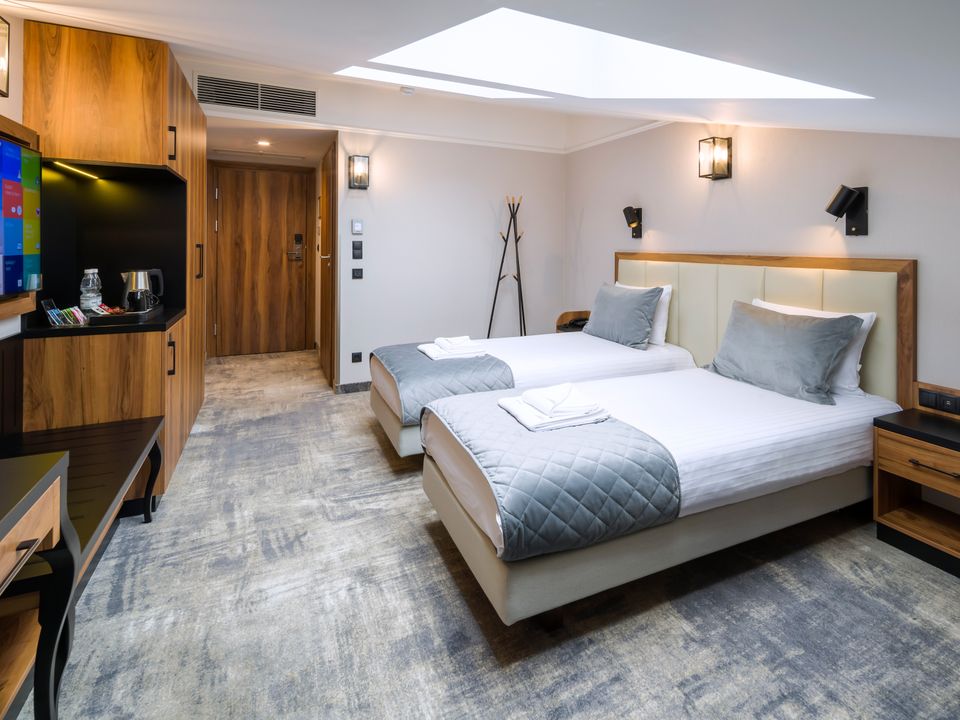 The room equipment has been designed for both individual clients and business travelers. The rooms have two comfortable hypoallergenic beds, TV SMART, tea and coffee making facilities. The air conditioning system keeps the room temperature perfect at all times. Even when your business duties require you to spend the whole day with your laptop in your room, we guarantee that working under the scenery of the sky on the ceiling will be pure pleasure. A bathroom with a shower cabin, underfloor heating, a hair dryer and a set of cosmetics will ensure extra comfort.