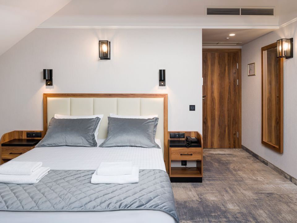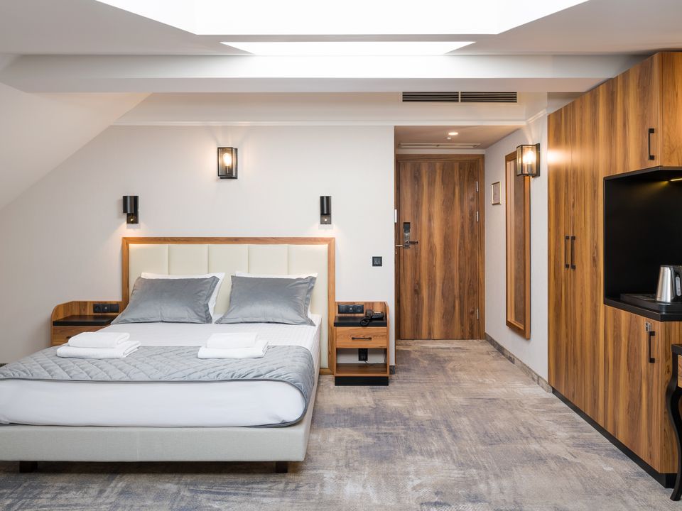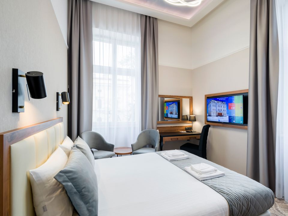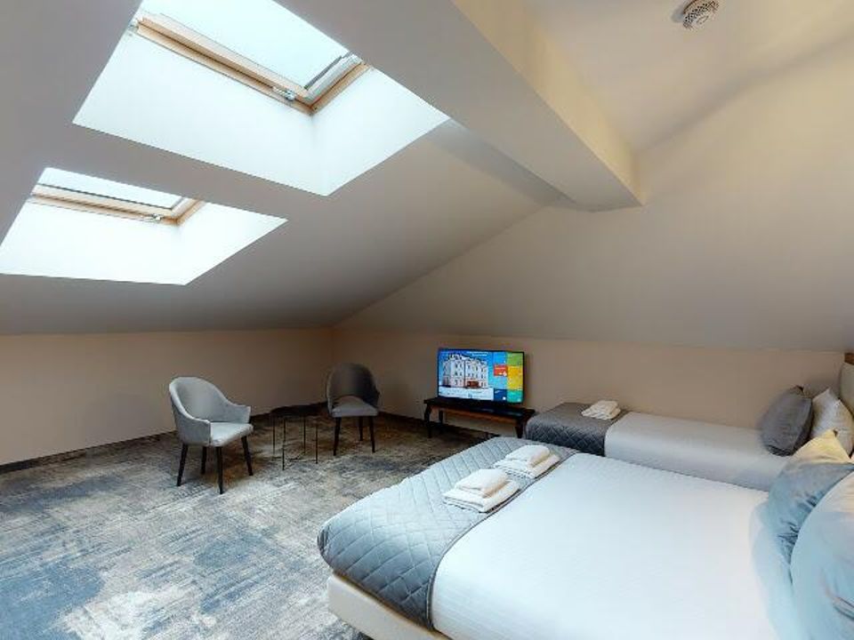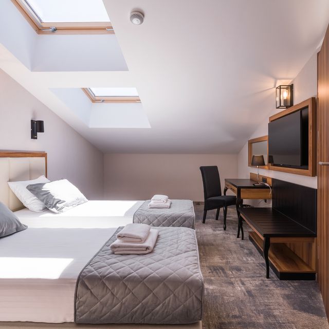 The two-person room in the attic Double is a cozy place for couples. The room is very quiet and the equipment does not differ from other rooms. Here you will also find a double bed 160 cm wide, a desk with a chair and a SMART TV. We are aware that every guest is unique and has their own preferences, which is why you can choose between bathrooms with a shower or a bathtub. Each room has a separate heating and air conditioning control panel so that you can adjust the temperature to your own needs.