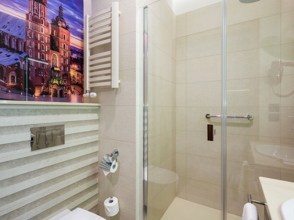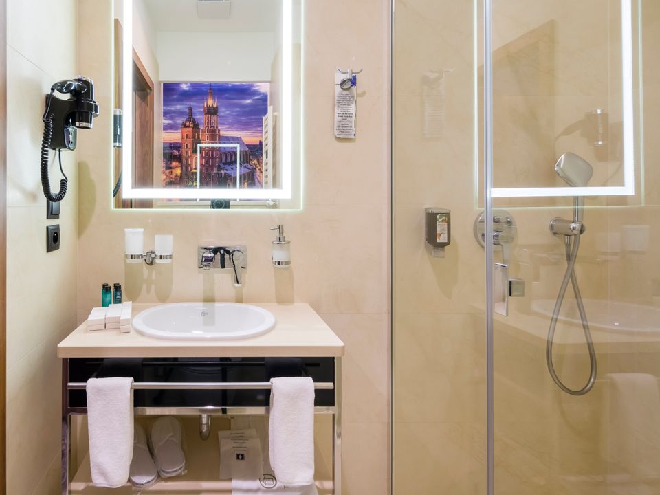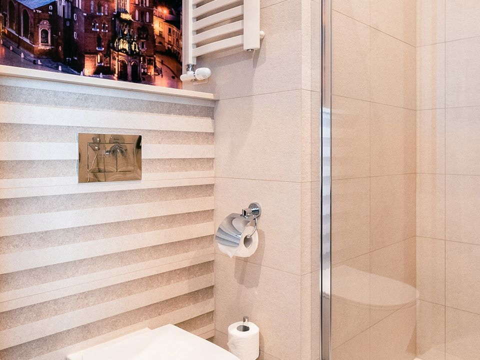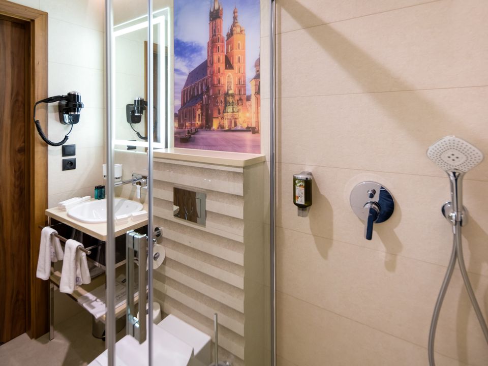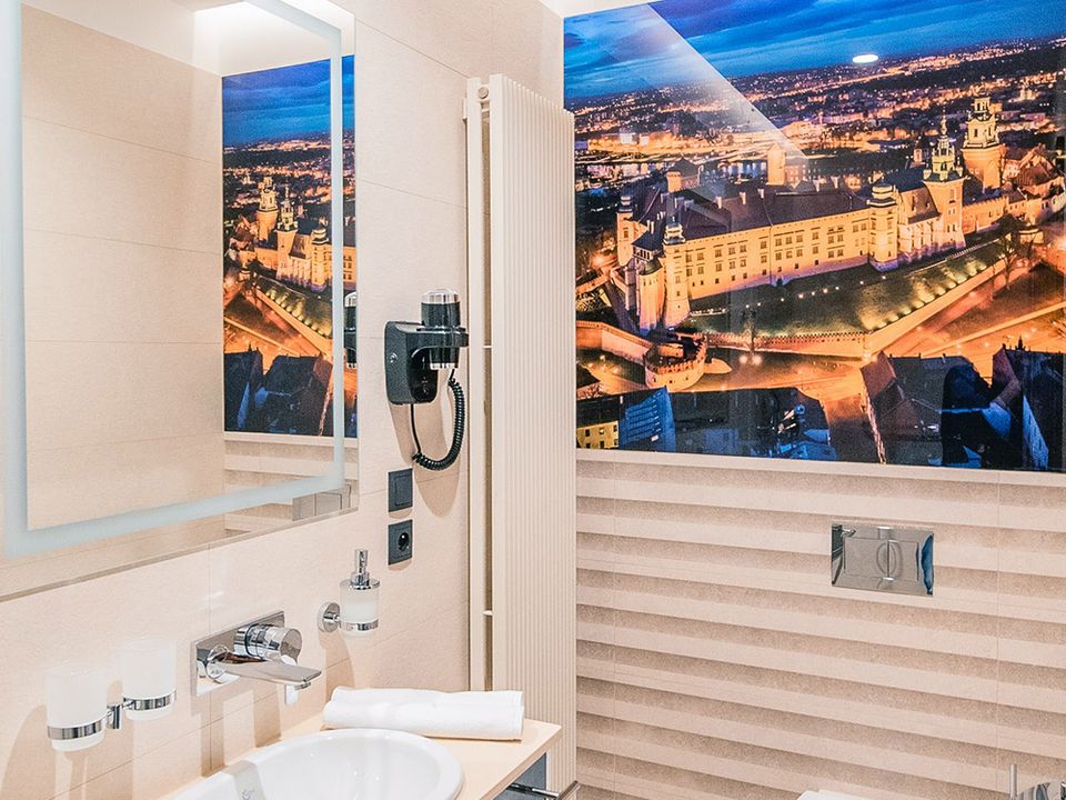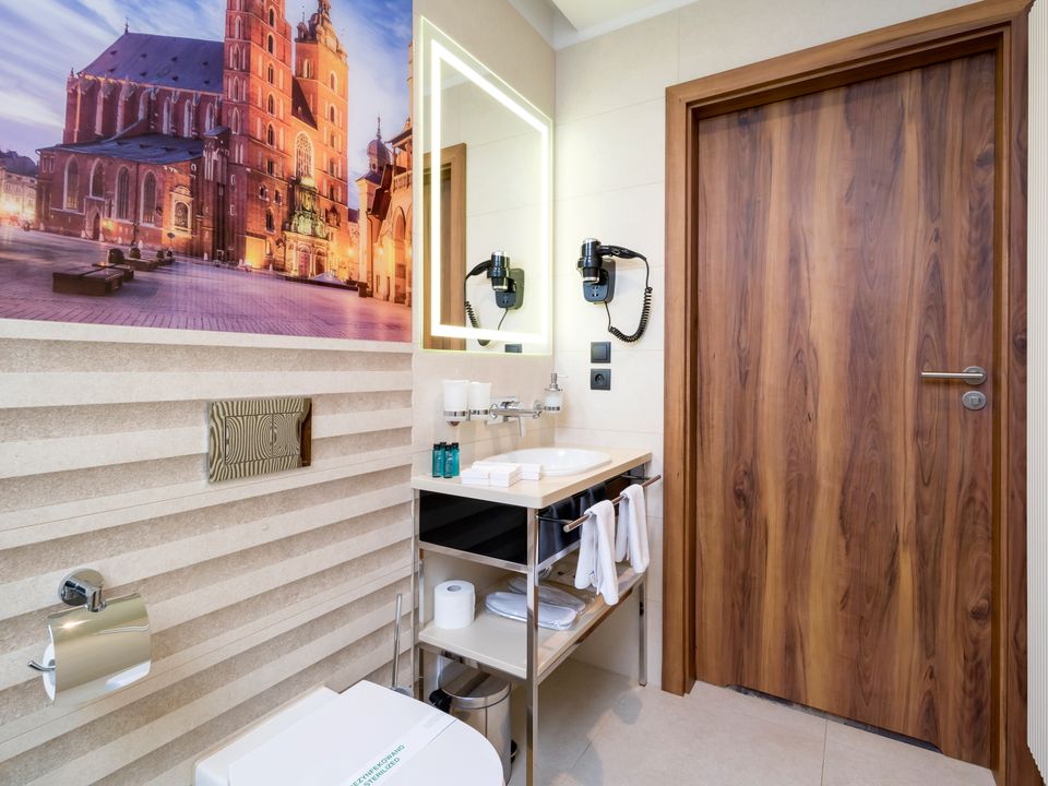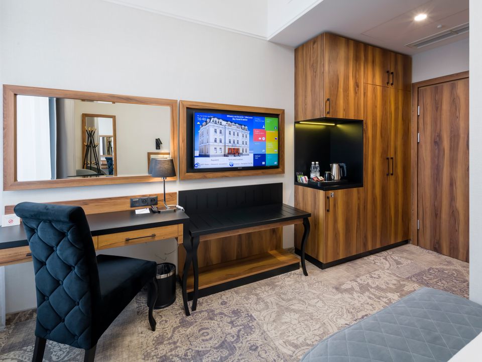 The room and bathroom have everything you could need during your visit to the capital of Lesser Poland. We guarantee a heavenly rest in a place designed beautifully with attention to every detail. We offer you a 160 cm wide bed, a large wardrobe, a desk and a chair, a refrigerator, a tea and coffee making set, a SMART TV and a safe. When packing for the trip, you mustn’t take cosmetics or a hair dryer – they are provided in our beautiful bathrooms.