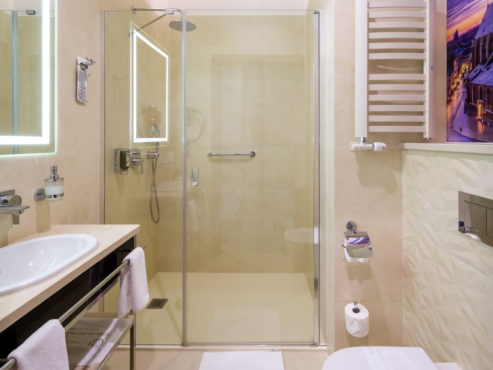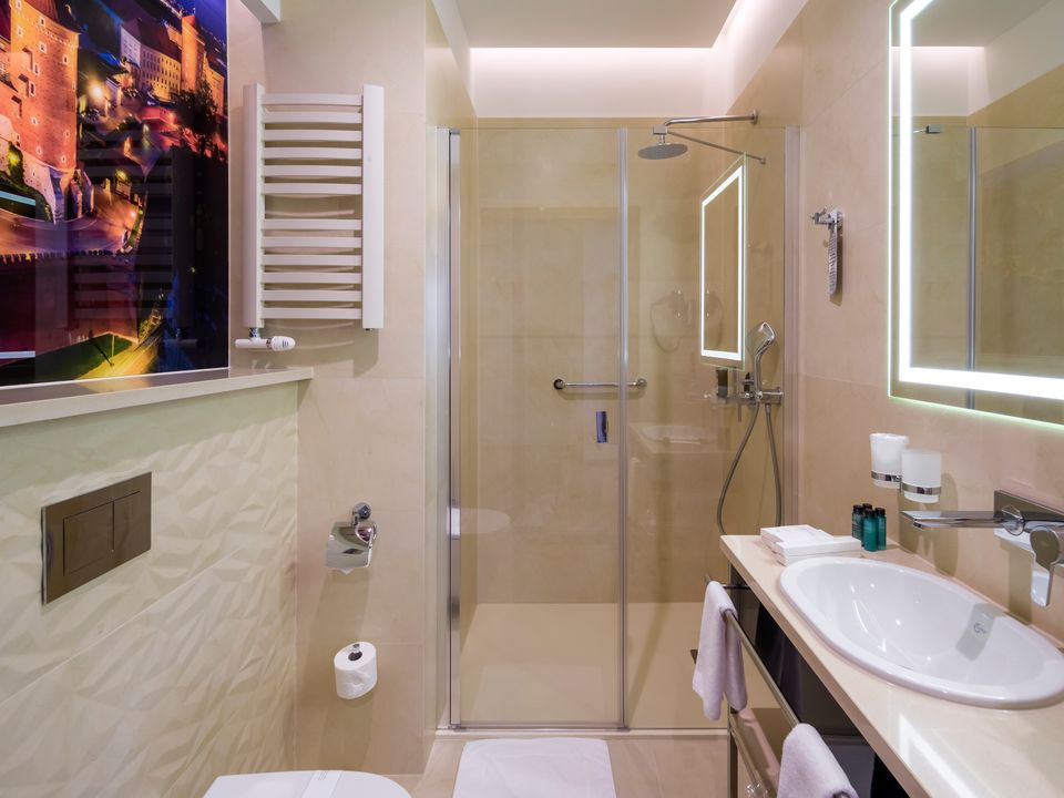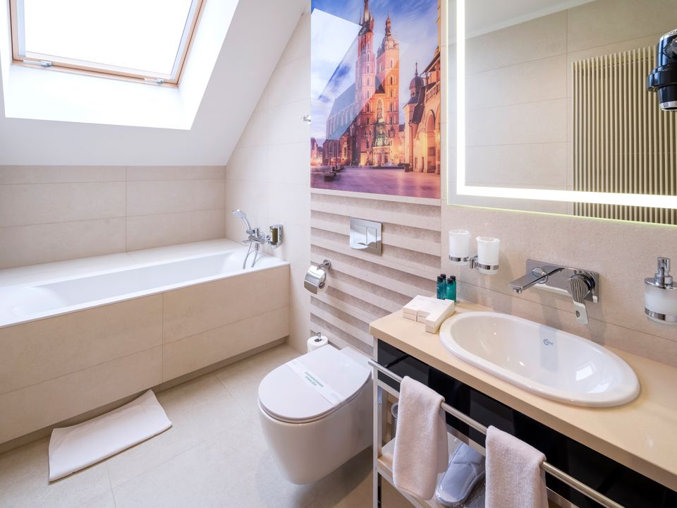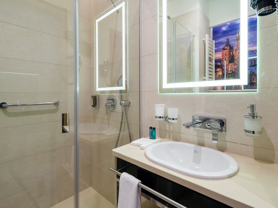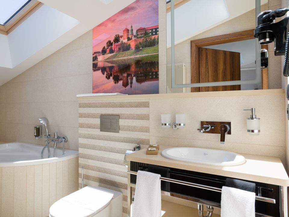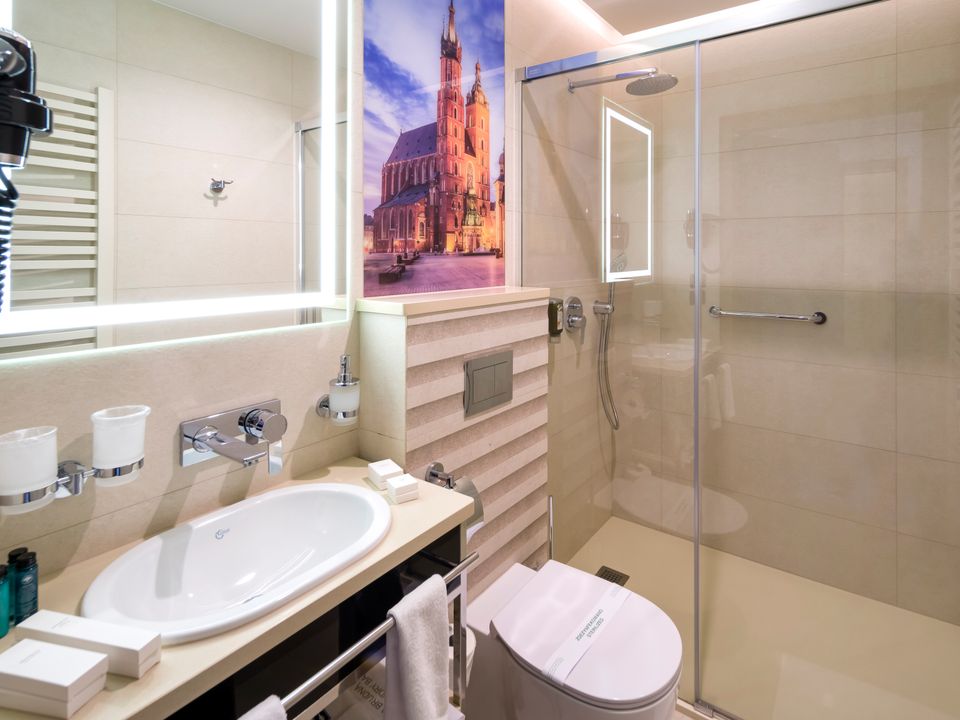 The room and bathroom have everything you could need during your visit to the capital of Lesser Poland. We guarantee a heavenly rest in a place designed beautifully with attention to every detail. We offer you a 160 cm wide bed, a large wardrobe, a desk and a chair, a refrigerator, a tea and coffee making set, a SMART TV and a safe. When packing for the trip, you mustn’t take cosmetics or a hair dryer – they are provided in our beautiful bathrooms.