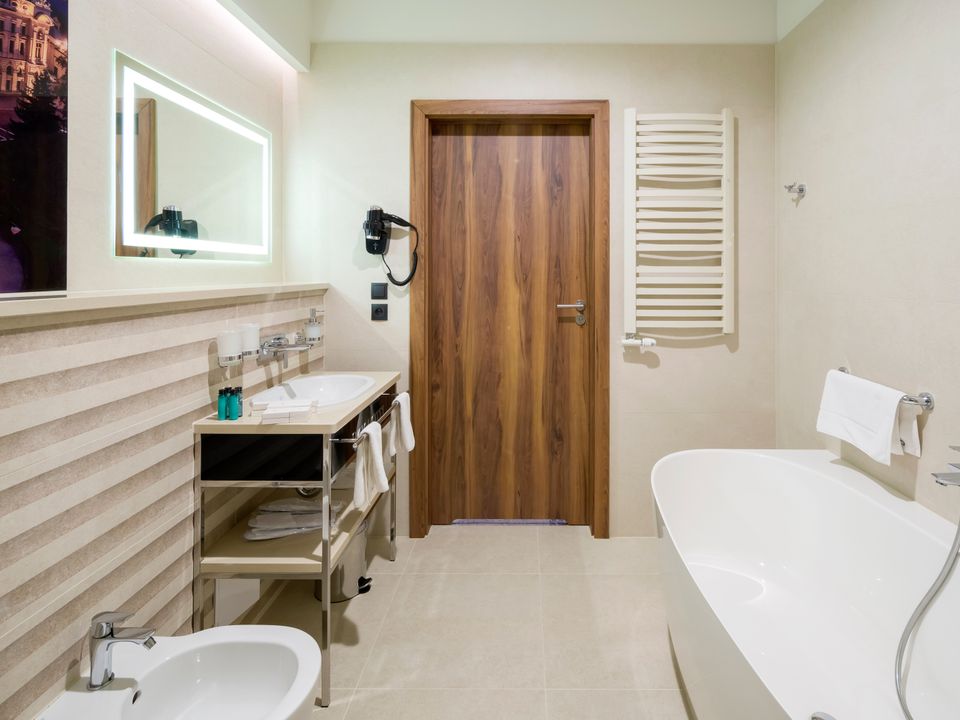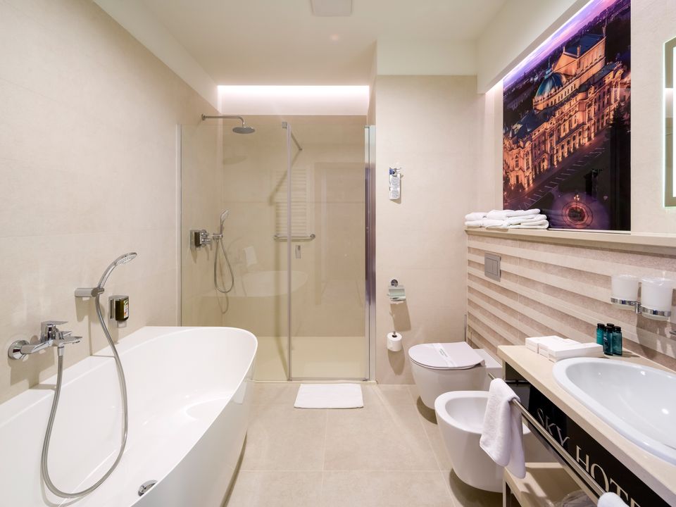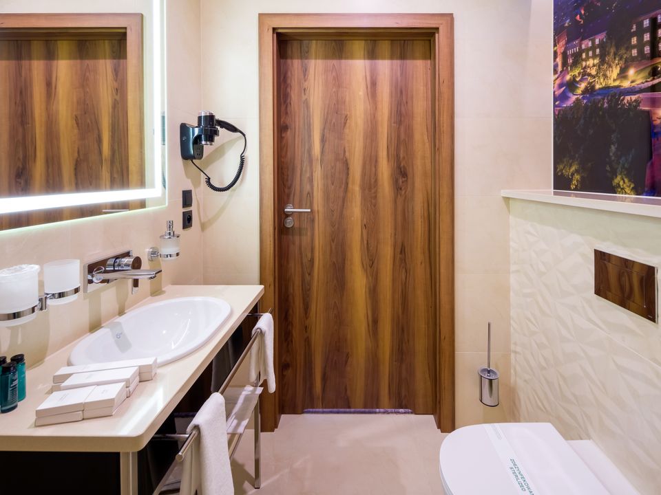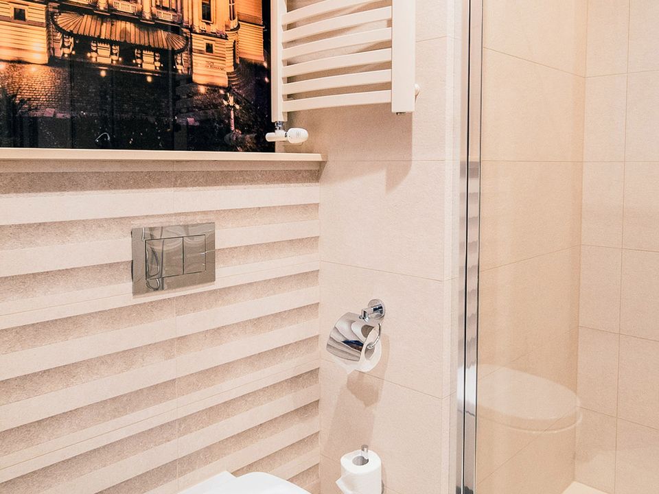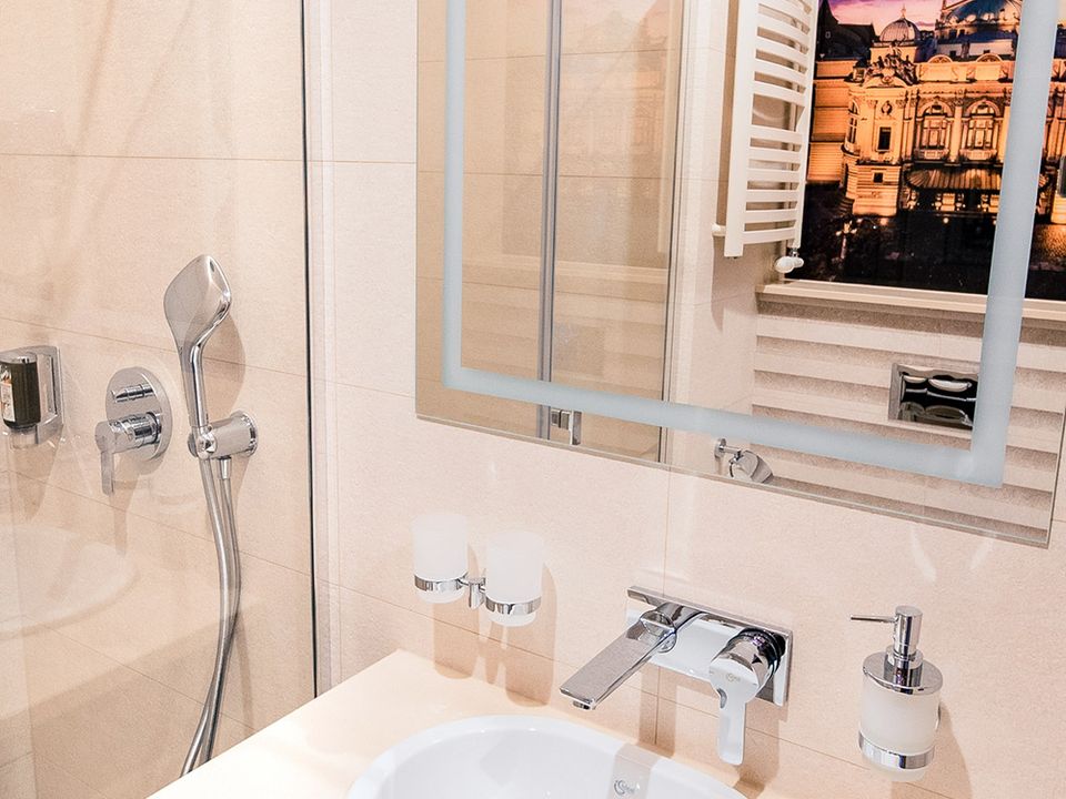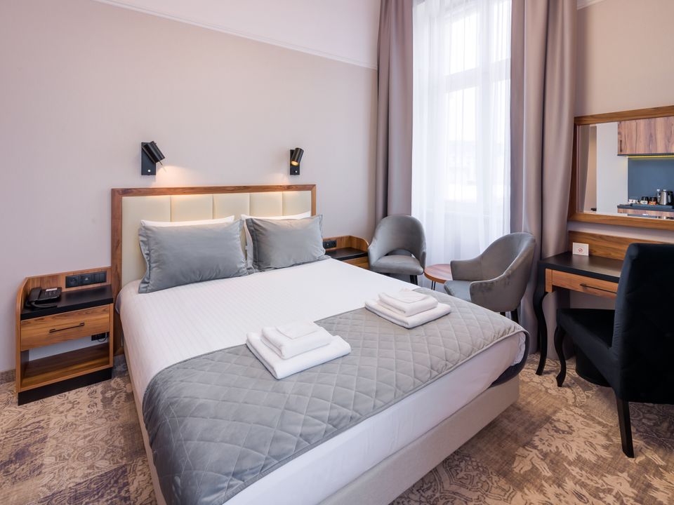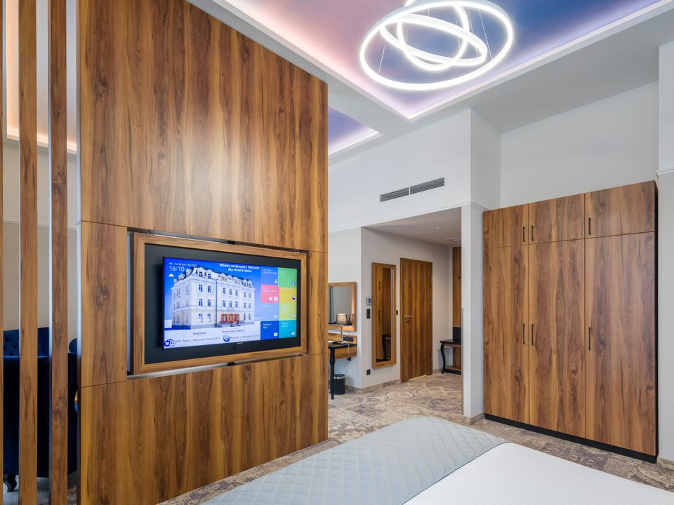 The room and bathroom have everything you could need during your visit to the capital of Lesser Poland. We guarantee a heavenly rest in a place designed beautifully with attention to every detail. We offer you a 160 cm wide bed, a large wardrobe, a desk and a chair, a refrigerator, a tea and coffee making set, a SMART TV and a safe. When packing for the trip, you mustn’t take cosmetics or a hair dryer – they are provided in our beautiful bathrooms.